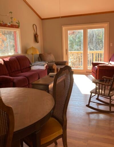 Bedrooms are comfortable but nothing fancy. There are two shared baths, as well as one room with a private bathroom. The retreat has a small staff, and residents will be responsible for keeping the building and grounds in order. Everyone will clear the table after meals, keep the meeting areas clean, and turn off the lights at night. We ask residents to view themselves as community members, not as guests. Internet is available, as well as (spotty) cell service. The town of Wilkesboro is a 15 minute drive down the mountain.